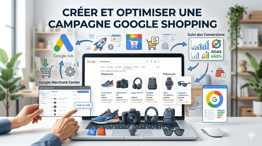 La configuration passe par Google Ads, l’installation du suivi des conversions et la création d’un compte Merchant Center avec un flux produit optimisé. La validation du site et le respect des exigences Google sont indispensables pour diffuser des annonces. Une fois les comptes liés, la création de campagnes permet de capter une intention d’achat élevée. Une stratégie bien structurée améliore le ROAS et transforme Google Shopping en levier puissant pour le marketing e-commerce.